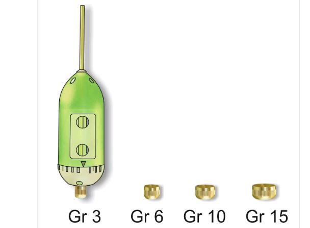 Pasturatore scorrevole con regolazione della grandezza dei fori consente di variare il flusso delle esche. Fornito con 4 pesi diversi intercambiabili rapidamente.